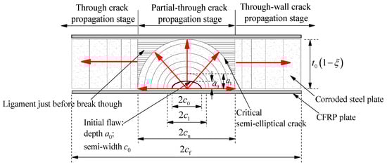 As shown in Figure 3, the crack propagation of the corroded steel plate strengthened with CFRP plates is a three-dimensional problem. The fatigue crack initiated and propagated from the bottom of the rust pits on the steel surface, and gradually developed from a semi elliptical partial-through crack to a penetration crack break through the thickness of the corroded steel plate. The crack propagation process of the corroded steel plate strengthened with CFRP plates was affected by many factors, such as the weight loss rate of corroded steel plate, the shape, size and position of the critical rust pits, the strengthening configuration of CFRP plates, the load transfer path of interface between the CFRP plate and corroded steel plate, etc. The stress intensity factor (SIF) and crack growth rate at different points along the crack front are completely different during the propagation process. To simplify the analysis process of crack propagation, in this study, the whole process of crack propagation of corroded steel plate strengthened with CFRP plates was divided into two stages; see Figure 4. The two-stage crack propagation prediction model of the corroded steel plate strengthened with CFRP plates was then proposed, and four basic characteristics of the model can be expressed as follows: