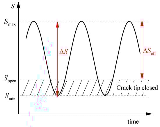 Elber [] discovered that the fatigue crack under the tensile load was already closed during unloading before the tension stress became zero via fatigue test, which was called the plasticity-induced crack closure phenomenon. According to the concept of SIF, the stress singularity at the tip of the crack, defined by the SIF, is present as long as the crack tip is open. Elber proposed that the stress variation will contribute to crack extension only if the stress singularity occurs at the crack tip, which drew out a new concept; namely, the effective stress range , as shown in Figure 4. The corresponding driving force of crack propagation became the effective SIF amplitude :