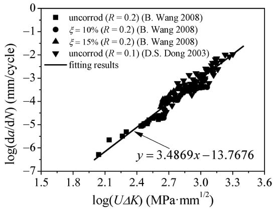 Figure 6 illustrates the relationship between the crack propagation rate and the effective SIF amplitude of Q235 steel plates. As shown in Figure 6, the crack propagation rate presented a good linear relationship with the effective stress intensity amplitude under the double logarithmic coordinate system, and the variation in corrosion rate ξ has little influence on the fatigue crack propagation rate. The main reason for this may be that the local stress concentration caused by rust pits on the corroded steel surface could be ignored compared with the stress singularity at the crack tip. The data in Figure 6 are fitted using the least square method, and the optimum fit values of the material constants C and m of the Q235 corroded steel plates are 1.7075 × 10−14 and 3.4869, respectively.