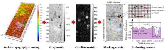 Figure 7 illustrates a method for identifying, extracting and evaluating rust pits on the surface of corroded steel plates based on three-dimensional topography scanning and watershed algorithm. As shown in Figure 7, the three-dimensional point cloud data were obtained via surface topography scanning of the corroded steel plates, and then the surface topography data of the corroded steel plate were directly written into the gray matrix through coordinate transformation to avoid the loss of surface corrosion details. Then, the gray matrix was successively filtered, and the gradient and watershed were calculated to obtain the marking matrix of the rust pits. Finally, the point cloud matrix and contour matrix of each rust pit were obtained by extracting the specific elements of the marking matrix. The dimensions (i.e., depth and width) of the critical rust pits perpendicular to the fatigue load direction could be calculated via the following equations:
