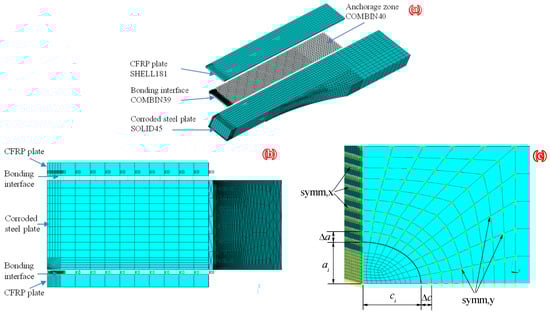 The specimen dimensions and configuration applied in the authors’ recent experimental study [], and shown in Figure 1, were adopted as the prototype structure. The commercial finite element code (ANSYS® 14.5) was employed, and the finite element model (FEM) of “Brick-Spring-Plate” was established to investigate the nodal force and opening displacement of elements before and after crack front of corroded steel plate strengthened with CFRP plates. Due to the existing symmetry, one quarter of the patched specimen was modeled by taking symmetric structures along the width and length of the specimen with the FE method, as shown in Figure 8. The corroded steel plate and the CFRP plate are simulated by eight-node solid element solid45 and four-node finite strain shell element shell181, respectively. The adhesive layer between CFRP plate and corroded steel surface is simulated by the nonlinear spring element COMBIN39; that is, three mutually perpendicular spring elements are inserted between the element nodes of corroded steel plate and CFRP plate, and the degree of freedom constraints in the x, y and z directions are realized by rewriting the element characteristic parameters KEYPOT (4). The static friction force of CFRP plate in the anchorage zone is simulated by bilinear force-deformation element COMBIN40. The load transfer and failure process of the interface between CFRP plate and steel plate in the anchorage zone are simulated by the “separation” function of COMBIN40.