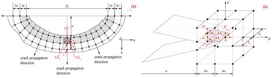where is the nodal force of the element in front of the crack propagation in the normal direction of the crack propagation surface; and are the opening displacements of node i and node j in the normal direction of the crack growth surface, respectively; is the area of the opening crack during the virtual crack propagation, , , is the virtual crack growth increment, and are the width of elements on both sides of the crack propagation direction, respectively, as shown in Figure 9. Consequently, the SIF at the crack tip can be calculated by substituting Equation (26) into Equation (22).