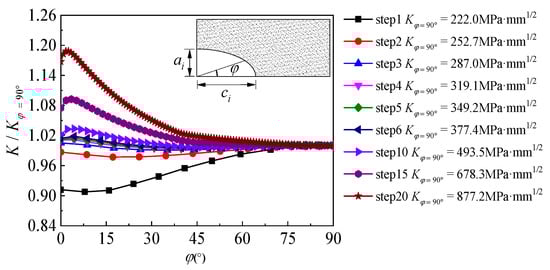 Figure 11 illustrates the distribution characteristic of SIF along the crack front of the semi-elliptical surface crack of specimen C9-DS1-A during the partial-through crack propagation stage, where the abscissa is the location angle φ which represents the position along the semi-elliptic crack front and the ordinate is the ratio of the SIF at each point along the crack front to the SIF at the deepest point (). As illustrated in Figure 11, at the initial stage of crack propagation, the K-value at the deepest point () is significantly larger than that at the material surface (), which means that the crack propagation rate in the depth direction will then be faster than that along the width direction, and the “slender” initial crack will become less “slender” with the continuous crack propagation. As the crack continues to propagate, the ratio of the SIF at each point along the crack front to the SIF at the deepest point gradually shrinks to approximately 1.0, the distribution of the SIF and crack growth rate at each point along the crack front tends to be gradual and consistent (see step 4~step 6 in Figure 11) and the shape characteristic (i.e., the ratio of width to depth) of the crack front tends to be stable. As the crack propagation continues, when the crack front is about to penetrate the thickness of the steel plate (see step 15~step 20 in Figure 11), the SIF values at each point along the crack front present significant differences again. The position of the maximum SIF shifts from the deepest point of the crack to the material surface, which means that the crack propagation rate near the steel plate surface will be faster than that along the crack depth direction before penetration, and the shape of the crack, i.e., the ratio of width to depth, becomes “slender” again.