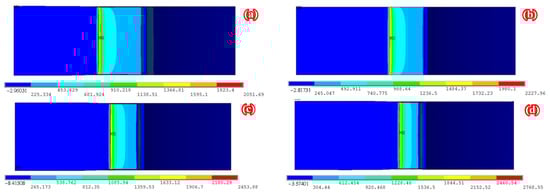 The models are established based on the dimensions and strengthening configurations of specimen C15-DS1-PS1-A. The prestress level of CFRP plate, which is defined as the ratio of the prestress to the tensile strength of the CFRP plate, is preset as 0%, 4.5% (i.e., specimen C15-DS1-PS1-A), 10%, 15% and 20%, respectively. The temperature reduction method is adopted to apply prestress to the CFRP plates, and the corresponding temperature loads, according to Equation (25), are 0 °C, −65.45 °C, −145.45 °C, −218.18 °C and −290.91 °C, respectively.