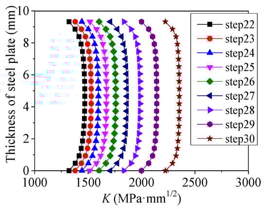 Figure 12 shows the distribution of tensile stress along the crack front of specimen C9-DS1-A during the through crack propagation stage. As shown in Figure 12, the tensile stress at each point along the crack front increases continuously with the continuous crack propagation; moreover, the tensile stress is symmetrically distributed along the thickness direction of the steel plate and the maximum tensile stress is in the middle of the plate thickness. Figure 13 depicts the distribution characteristic of the SIF at the crack front along the thickness direction during the though crack propagation stage. It can be found from Figure 13 that the SIF values at the crack front are symmetrically distributed along the thickness direction of the steel plate. The K-value at the crack front in the middle of the steel plate thickness is greater than that at the surface of the steel plate, which means that the crack propagation rate in the middle of the steel plate thickness is greater than that at the surface of the steel plate. This phenomenon is consistent with the difference in the crack growth rate between the material surface and the middle of the steel plate thickness caused by the plastic induced crack closure effect, and it also explains the phenomenon that the crack front gradually protrudes forward and outward with the crack propagation, which was observed in the authors’ recent fatigue test [].