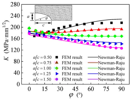 where and were the growth increments of the cracks in the depth and width directions, respectively; was the increment of fatigue cycles, ΔKai and and were the stress intensity factor amplitudes corresponding to the position of crack depth and half-width , respectively. It can be obtained from Equations (6) and (7):
