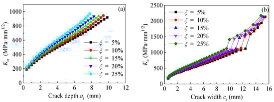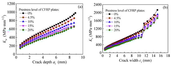 Figure 25a,b present the effect of prestress level of CFRP plate on the values of Ka and Kc at the crack tip of the corroded steel plate strengthened with CFRP plates. As presented in Figure 25, both the values of Ka and Kc at the crack tip can be significantly reduced by applying pretension stress to the CFRP plates, and the K-values decrease continuously with the increasing prestress of the CFRP plates. The larger the crack size, the greater the reduction in K-values.