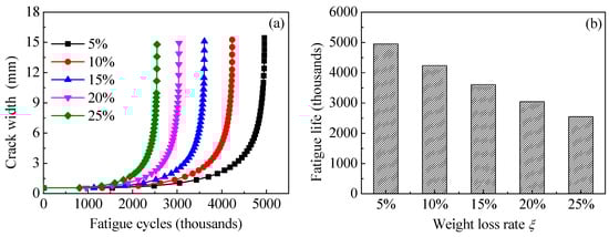 Figure 20a,b shows the effect of equivalent initial crack size on the crack propagation curves and the fatigue life of the corroded steel plate strengthened with CFRP plates, respectively. As shown in Figure 20, the initial crack size has a significant effect on the fatigue crack propagation. The larger the initial crack size, the higher the crack growth rate and the lower the fatigue crack propagation life. Interestingly, when the depth of equivalent initial crack increases from 0.3 mm to 0.4 mm with an increment of 0.1 mm, the corresponding fatigue crack propagation life decreases by 605 thousand cycles, while when the depth of equivalent initial crack increases from 0.6 mm to 0.7 mm with the same increment of 0.1 mm, the decrement in the corresponding fatigue crack propagation life is merely 393 thousand cycles. This confirms that a larger part of the crack propagation life is consumed by crack growth of the smaller crack size. The smaller the initial crack size, the more sensitive the crack propagation life to the variation in equivalent initial crack size. It can also be found from Figure 20 that when the depth of the equivalent initial cracks increases from 0.3 mm to 0.7 mm with an increase of merely 0.4 mm, the corresponding fatigue crack propagation life decreases by more than 60%. This indicates that when the CFRP strengthening system is applied to improve the fatigue performance of the corroded steel structures, it should be carried out when the dimensions of the rust pits or the cracks of the corroded steel plate are still small, and early repair is suggested in order to achieve the best fatigue life extension of the corroded steel structures.