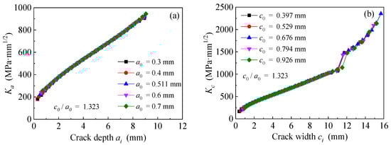 Effect of equivalent initial crack size on the K-values at crack tip of the corroded steel plate strengthened with CFRP plates: (a) Ka vs. crack depth , and (b) Kc vs. crack width .