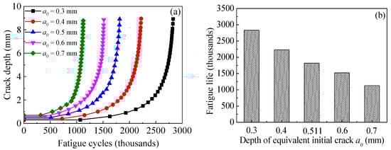 Effect of equivalent initial crack size on (a) the crack propagation curves and (b) the fatigue life of the corroded steel plate strengthened with CFRP plates.