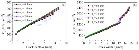 The models are established based on the dimensions and strengthening configurations of specimen C15-DS1-A. The thickness of the external bonded CFRP plates which present the strengthening stiffness are preset as 0.5 mm, 1.0 mm, 1.4 mm (i.e., specimen C15-DS1-A) and 2.0 mm, respectively. Figure 23a,b depict the effect of strengthening stiffness of CFRP plate on the values of Ka and Kc at the crack tip of corroded steel plate strengthened with CFRP plate, respectively. As shown in Figure 23, as the thickness of CFRP plate increases from 0.5 mm to 1.0, 1.4 and 2.0 mm, the values of Ka and Kc which correspond to the same crack size, decrease continuously, and the decrement of K-values caused by the increasing thickness of CFRP plate becomes more and more significant with the increases in crack size. Interpretations made based on Figure 23 may be summarized as follows: the increase in the thickness of CFRP plate and the crack propagation size lead to the increase in the strengthening stiffness ratio, which is expressed as the ratio of the CFRP plate stiffness to the residual stiffness of the steel plate corresponding to the crack propagation section. The “bridging effect” of CFRP plate on restraining the crack opening becomes more and more obvious, resulting in the continuous reduction of the K-values at the crack tip.