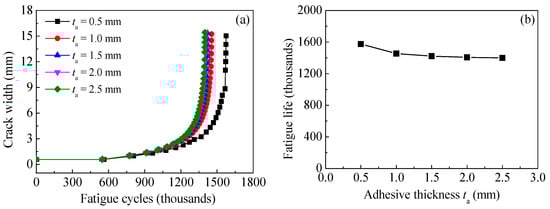 Effect of adhesive thickness on (a) the crack propagation curves and (b) the fatigue life of the corroded steel plate strengthened with CFRP plates.