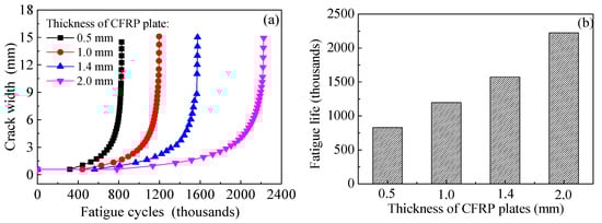 Figure 24a,b illustrate the effect of stiffness of CFRP plates on the crack propagation curves and the fatigue life of the corroded steel plate strengthened with CFRP plates, respectively. As shown in Figure 24, with the increase in the strengthening stiffness of CFRP plates, the crack propagation rate decreases, and the fatigue life increases. When the thickness of CFRP plate increases from 0.5 mm to 1.0 mm, 1.4 mm and 2.0 mm, it leads to fatigue life extension of 1.44 times, 1.90 times and 2.69 times, respectively. This indicates that the fatigue strengthening effect of the corroded steel plate with external patched CFRP plates can be significantly improved with the increasing thickness (stiffness) of the CFRP plates.