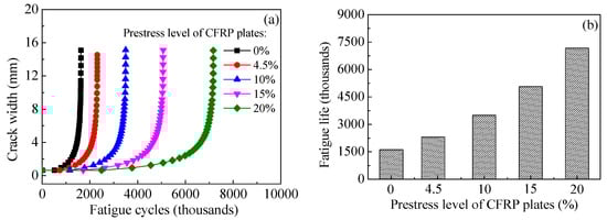 Effect of prestress level of CFRP plate on (a) the crack propagation curves and (b) the fatigue life of the corroded steel plate strengthened with CFRP plates.