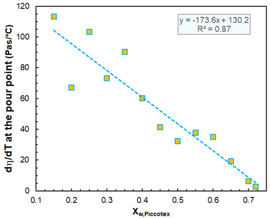 Variation in the dη/dT values at the pour point with the Piccotex content. The shear rate was 10 s−1.