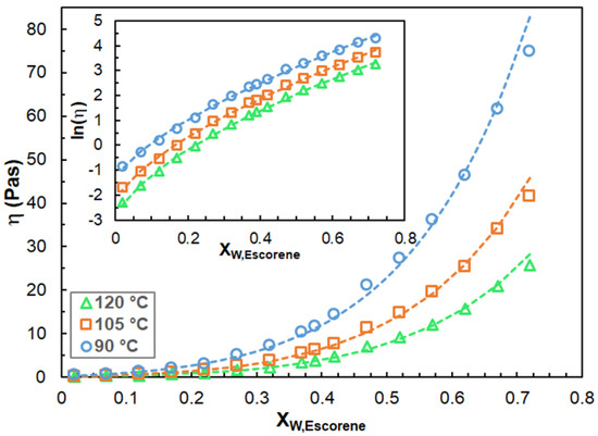 The viscosity versus weight fraction of Escorene at temperatures of 90 °C, 105 °C and 120 °C. The inset shows the ln(η) versus Xw,Escorene curves. The symbols and the dashed lines stand for the experimental and the fitted data (via Equation (5)), respectively. The fitted parameters are: α = 0.045, 0.089, 0.230; β = 28.5, 24.3, 19.3; and γ = 0.616, 0.640, 0.673. The shear rate was 10 s−1.