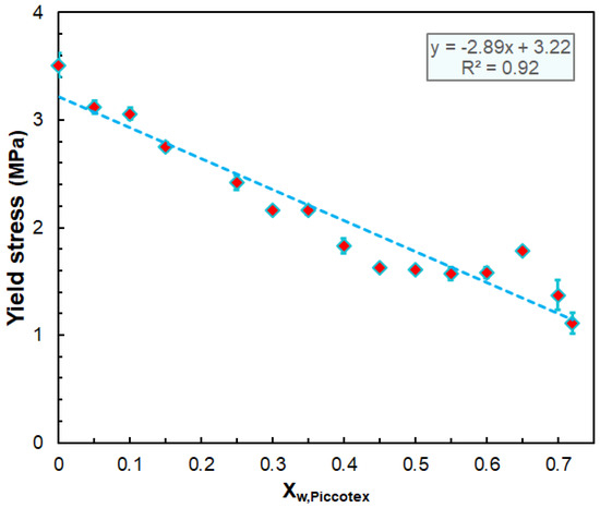 As expected, according to the data of Table 3, the mechanical properties are influenced by the composition of the blend. As a general tendency, it can be established that the yield stress decreases linearly with the Piccotex content, as also shown by Figure 6.