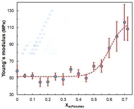 The dependence of the Young’s modulus on the Piccotex content can be characterized by a four-parameter sigmoid model (Equation (10)).