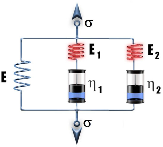 In order to render the mechanical stress (σ)–strain (ε) curves up to the onset of yielding, the viscoelastic standard linear solid (SLS), also known as the Zener model [32], extended with an additional Maxwell element (a spring and a dashpot in the series) was applied [33] (Figure 8). It is to be noted that the single SLS model was also successfully used for polymeric systems, including polyurethanes [34,35].
