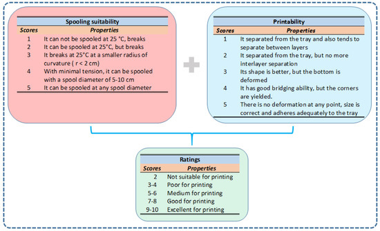 To rate the blends in terms of 3D printabilty, we introduced two ratings: one is concerned with the spooling suitability and the other is related to the printability of the blends according to the scores detailed and compiled in Figure 10.