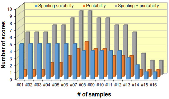 The ratings of blend samples #01–#16 according to their spooling suitability and printability.