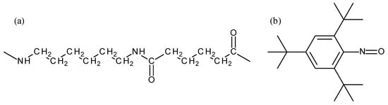The materials used for the spin-trapping experiments presented in this study are shown in Figure 1. PA66 was synthesized by polycondensation from the nylon salts constituted with adipic acid and hexamethylenediamine at 285 °C under a vacuum of 20 Pa and then purified by reprecipitation with 1,1,1,3,3,3-hexaflouro-2-isopropanol (HFiP)/methanol. The weight average molecular weight, Mw, of the obtained PA66 measured by GPC was 43,600. The spin-trapping reagent was 1,3,5-tri-tert-butyl-2-nitrosobenzene (TTBNB), which was purchased from Tokyo Chemical Industry Co., Ltd. (Tokyo, Japan); HFiP and methanol were purchased from Fluorochem Ltd. (Derbyshire, UK) and FUJIFILM Wako Pure Chemical Co. (Osaka, Japan), respectively.