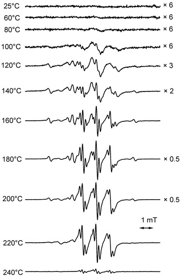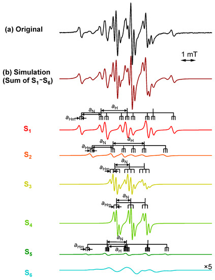 After elaborate trial and error analyses of the estimation of the produced radical species and the assumption of their spectral parameters, it was concluded that the spectrum consists of a maximum of six spin adduct components. Figure 5 shows an example of a simulation analysis of a spectrum heated to 160 °C, in which all six components can be observed. The assignments of the spin adduct radicals and their hyper coupling constant (hfcc) and g-values are shown in Table 2, together with the literature references for assignment.