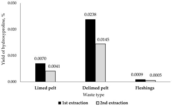 Since hydroxyproline is a kind of amino acid marker of collagen and elastin, a comparative analysis for its content was performed in the experimental solutions. The highest concentration of hydroxyproline was found in the solutions after the first extraction (Figure 1), as well as in the solution from limed pelt (1.1 and 5.3 times more compared to delimed pelt and fleshings samples, respectively). However, based on the volume of collagen solutions obtained after the first and second extractions, the highest yield of hydroxyproline by weight (and hence collagen) was observed in the samples obtained from delimed pelt (Figure 1).