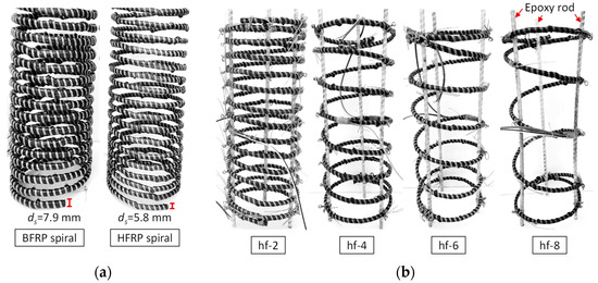 The mechanical and physical properties of spirals are provided in Table 3 and Figure 2b, where df refers to the diameter of the spiral; Af refers to the cross-sectional area of the spiral; ff and Ef refer to the tensile strength and elastic modulus of the spiral, respectively; and εfu refers to the ultimate strain of the spiral. The characteristic strength and modulus values of the spirals are the minimum values provided by the manufacturer. Since the spirals could not be directly tested (under axial tension), their strength and modulus values (in Table 3) were indirectly obtained through a tensile test (according to ASTM D7205M-06 [28]) with corresponding longitudinal HFRP (or BFRP) rods, which contained the same components as the spirals. However, due to possible fiber kinking in the spirals [29] (generated from manufacturing and application processes), their actual in-service mechanical properties could decrease.