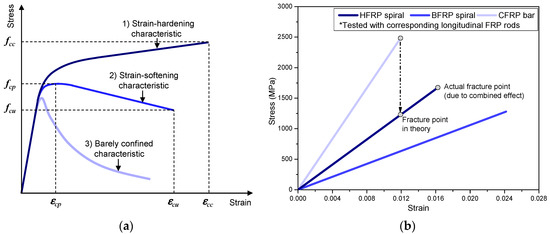The reinforcement details of the hf and bf cylinders are shown in Figure 1b. Different spacings of spirals were designed to achieve different constraint effects for the cylinders. There were three characteristic stress–strain relationships examined for the FRP-confined concrete, i.e., (1) stress–strain relationships with strain-hardening characteristics; (2) stress–strain relationships with strain-softening characteristics; and (3) barely confined characteristics (with almost no constraint effect). These are shown in Figure 2a, where fcu and εcu refer to the compressive ultimate stress and strain of a cylinder with strain-softening characteristics, respectively. These characteristics were mainly controlled by the confinement strength and stiffness, which could vary with spiral spacing and elastic modulus, as designed in the current test. The thickness of the concrete cover of the reinforced cylinders (dc) was 15 mm. To fix the position of the HFRP (or BFRP) spirals in cylinders, three epoxy rods (diameter = 3 mm, fabricated with vinyl epoxy resin) were used as longitudinal reinforcement, as shown in Figure 1b. Their compressive contribution (to the cylinder) was neglected due to their minute cross-sectional area and brittle fracture feature.