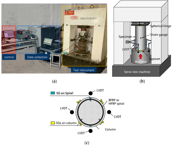 There were three series of cylinders with different reinforcements designed in the test: (1) plain concrete cylinders (pc); (2) basalt-fiber-reinforced polymer (BFRP) spiral (Figure 1a) reinforced cylinders (bf); and (3) hybrid fiber-reinforced polymer (HFRP) spiral (Figure 1a) reinforced cylinders (hf). Details of all the types of cylinders are listed in Table 1, where s refers to the spiral spacing; ρf refers to the transverse reinforcement ratio; fcp and εcp refer to the compressive peak stress and strain of a cylinder with strain-softening characteristics, respectively; and fcc and εcc refer to the compressive ultimate stress and strain of a cylinder with strain-hardening characteristics, respectively.