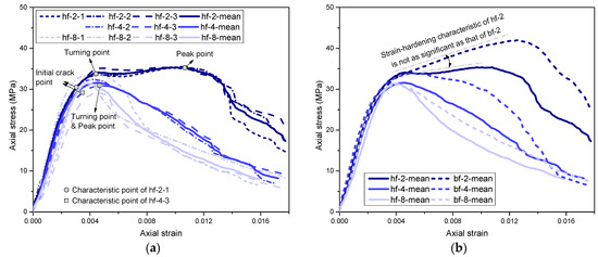 Table 1 lists the test results, which are the averaged mean values of three specimens for each type of cylinder. The typical axial stress–strain curves of the hf series cylinders are shown in Figure 4a. In addition, mean stress–strain curves averaged from three stress–strain curves for each type of cylinder are provided in Figure 4a (as “hf-2-mean”, “hf-4-mean”, and “hf-8-mean”). Particularly, the stress–strain curves of each type of column were first normalized with the same loading strain step (0.01). Then, the mean stress value (at each loading strain step) was averaged from the stress values of three specimens. Note that the stress–strain curve of the hf-4-1 curve was missed due to an unexpected test failure. The curve of the hf-4-mean in Figure 4, as well as the test results of the hf-4 cylinder in Table 1, were averaged only from hf-4-2 and hf-4-3.