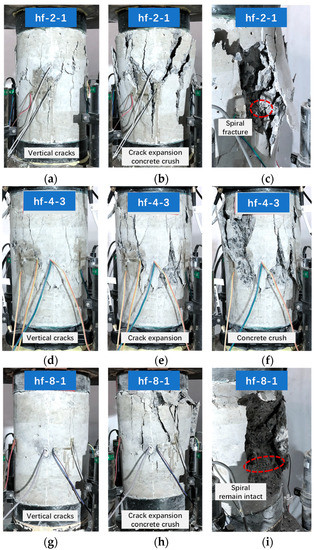 The hf-4- and hf-6-type cylinders revealed similar failure processes. Taking hf-4-3 as an example, as shown in Figure 5d–f, the failure process of hf-4-3 was similar to that of the hf-2-1 cylinder during the initial loading process before the turning point (i.e., peak stress point) was reached, as shown in Figure 4a. After the turning point, the axial stress decreased (instead of increasing as that of hf-2-1) with the development of axial strain. A strain-softening characteristic was revealed due to relatively low confinement [33]. When the axial strain reached 0.013, a crisp fracture sound was captured, possibly due to the fracture of the HFRP spiral. Then, the concrete was gradually crushed, indicating specimen failure.