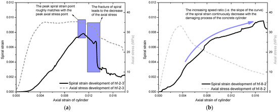 For well-confined cylinders (such as the hf-2-3 cylinder), the spiral strain developed slowly with the axial strain during the initial loading process due to the relatively small transverse expansion of the concrete cylinder. Once the axial strain reached 0.002, the spiral strain quickly increased with the development of the axial strain. After the axial strain reached 0.004, despite the axial stress stopping due to continuous damage of the concrete, the spiral strain could keep rising (almost linearly) with the axial strain, as shown in Figure 6a. It indicated that efficient confinement was enforced to the concrete core. Therefore, the concrete core could remain intact during this process until the failure of the HFRP spiral. When the axial strain reached around 0.011, the HFRP spiral finally fractured and, thus, triggered the failure of the concrete core. The axial stress started decreasing. This specific failure mechanism could be confirmed by comparing the peak spiral strain point to the peak axial stress point, which were roughly matched, as shown in Figure 6a. After that, the undamaged HFRP spiral section could continuously fracture and, finally, resulted in a dramatic decrease in axial stress, as shown in Figure 6a.