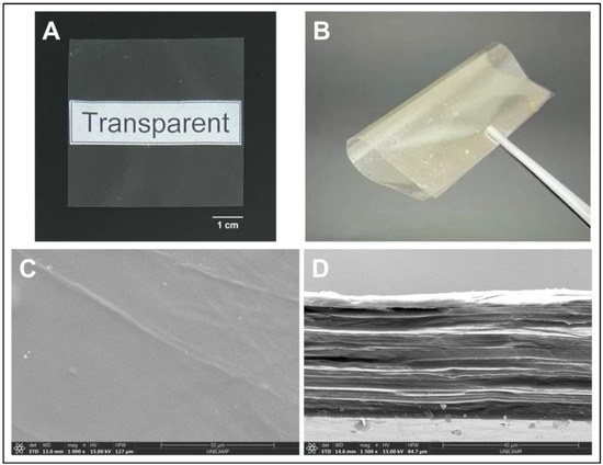Typical visual aspect of the membrane produced. Images showing (A) the transparency and (B) flexibility of the membrane analyzed with the naked eye; images showing the membrane (C) microstructure of the surface and (D) cross-section of the membrane by SEM.