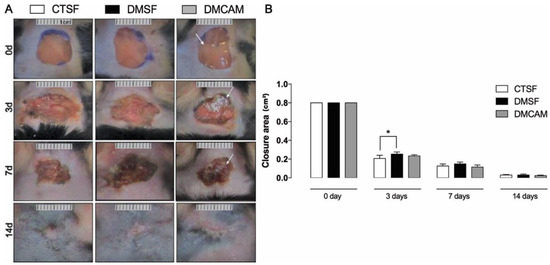 (A) representative images of the healing process were monitored at day 0, 3, 7, 14 after injury. (B) Wound areas were quantified and expressed as closure area (cm2), and area analyzed with ImageJ® of normoglycemic animal groups submitted to topical treatment with 0.9% saline solution (CTSF group); of hyperglycemic animals submitted to topical treatment with 0.9% saline solution (DMSF group); and hyperglycemic animals submitted to a topical solution with chitosan-alginate membranes (DMCAM group) on post-wound days 3, 7 and 14. Arrows indicate the presence of alginate and chitosan membranes (CAM) in the wound bed. * Groups statistically different (p < 0.05), compared by One-way ANOVA, followed by a Tukey multiple comparison test.