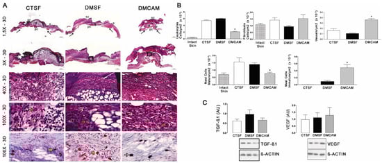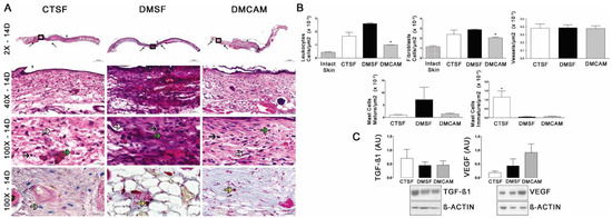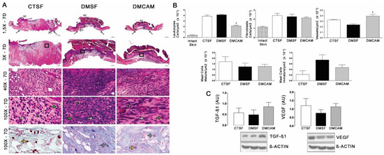 According to the qualitative and quantitative histopathological analysis of the skin collected on post-wound day 14 and stained with H&E, a smaller number of leukocytes and fibroblasts was observed in group DMCAM in comparison to groups CTSF and DMSF (p < 0,05). In group CTSF, a higher quantity of mastocytes was observed in relation to groups DMSF and DMCAM (Figure 5A,B). Western blotting analysis for TGF−β1 and VEGF did not demonstrate statistical differences (Figure 5C).
