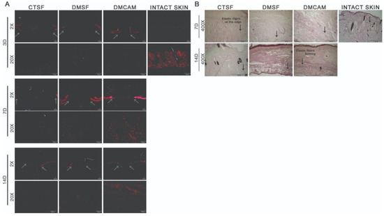 There was no difference among groups on post-wound day 3 in regard to distribution, deposition, organization, and thickness of the collagen fibers (Figure 6A). On post-wound day 7, through both staining analyses, collagen fibers with a discreet red-orange birefringence were observed in the DMCAM group scars when compared to what could be observed in groups CTSF and DMSF (Figure 6A). As to the elastic fibers in the DMCAM group, a small concentration of thinner elastic fibers was observed, indicating the beginning of the production of this type of fiber at that time point (Figure 6B). On post-wound day 14, improved reorganization of the papillary dermis and enhanced red-orange birefringence of collagen fibers in the healing region of the DMCAM group was observed, as well as a network-shaped orientation, similar to intact skin (Figure 6A). As for the elastic fibers in the DMCAM group, there was an improvement in the reorganization of the elastic fibers, scattered on all of the neodermis, with a larger presence of eulanin microfibrils. This also shows a similar pattern to the elastic fibers of intact skin. Eulanin microfibrils are thicker and considered essential for the elastogenesis process of the skin (Figure 6B).