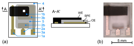 Topology of an amperometric NO2 sensor (a): working electrode contact (1a), carbon working electrode (1b), pseudo-reference electrode contact (2a), pseudo-reference electrode (2b), counter electrode contact (3a), counter electrode (3b), substrate (4), solid polymer electrolyte (SPE) (5), white square indicates the location of Raman spectroscopy measurements of the WE electrode. (b) Sensor with MWCNT working electrode and SPE layer treatment 120 °C for 90 s.
