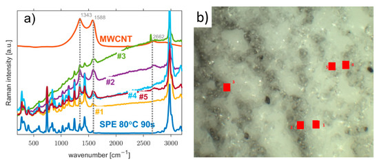 (a) Raman spectra of the MWCNT working electrode and solid polymer electrolyte (SPE treated at 80 °C for 90 s) and their mutual interface corresponding to marked positions from #1 to #5 at (b) confocal microscopy image of their acquisition locations.
