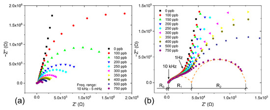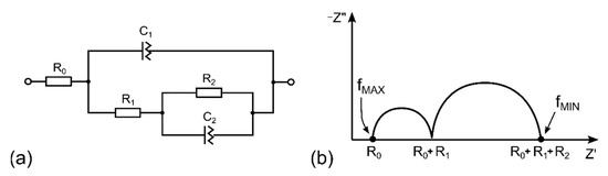 Electrochemical impedance spectroscopy (EIS) is a universal and nondestructive technique that allows observation of the response of the studied system (sample) over a wide frequency range and description of the sample by an equivalent electric circuit (EEC). Figure 4 shows the equivalent electric circuit designed for the presented NO2 sensor (4a) and an ideal complex impedance plot for the circuit with two well-separated time constants (4b).