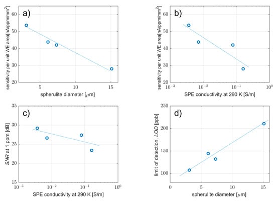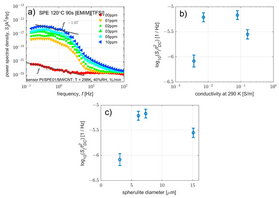 The samples yield different levels of current fluctuations. In order to compare the level of fluctuations of the adsorbed molecules on the WE–SPE interface, the ratio of the spectral density of current fluctuations at 1 Hz to the square of the direct current is determined. The frequency of 1 Hz was selected with regards to the change of spectral density of current fluctuations for detected substance concentrations from 1 ppm to 10 ppm. Figure 9b shows that the SI/I2 ratio remains nearly constant within one order of magnitude compared to a change in conductivity of more than two orders of magnitude. The increase in spherulite diameter is shown in Figure 9c. This indicates, as mentioned above that the main source of noise is associated with charge transport at the electrode–electrolyte interface [57].
