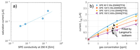 Figure 8a shows the dependence of saturation current on SPE conductivity obtained from fitting the analysis of particular calibration curves presented in Figure 8b. These results indicate that the level of saturation current is influenced by SPE conductivity; the lower the SPE conductivity, the lower the saturation current. It should be noted that the authors were able to perform the fitting analysis based on the Langmuir adsorption isotherm without any doubt due to previous studies [40,45], where similar sensors were tested over a wider concentration range.