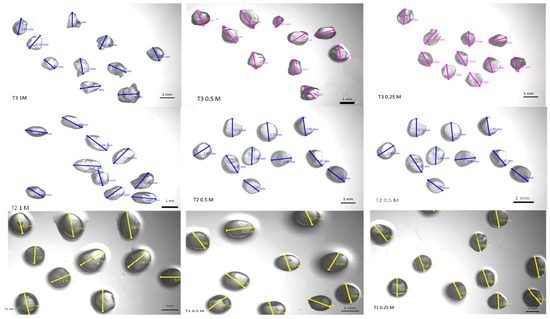 Size and morphology of the alginate particles produced with different sodium alginate and calcium chloride concentrations visualized through a microscope (magnification of 40×). T1, T2, and T3 contained 2%, 1.5%, and 1% of sodium alginate, respectively, and were crosslinked with calcium chloride at concentrations of 1, 0.5, and 0.25 mol·L−1. All alginate solutions contained phenolic compounds (2.55 mg gallic acid·g−1 of microalgae).
