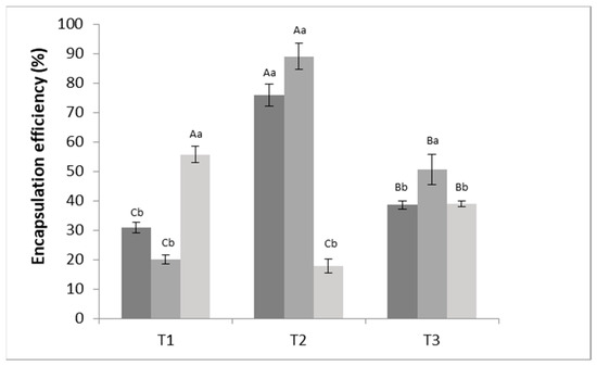 Encapsulation efficiency (%) of phenolic compounds incorporated in alginate particles produced using different alginate and CaCl2 concentrations. T1 = 2% sodium alginate; T2 = 1.5% sodium alginate; T3 = 1% of sodium alginate. Different colors of the bars represent different calcium chloride concentrations (■—1 mol·L−1, ■—0.5 mol·L−1, ■—0.25 mol·L−1). Averages followed by uppercase letters are related to significant differences among tests T1, T2, and T3, while lowercase letters are correlated to significant differences according to molar concentrations within the same test (p ≤ 0.5).