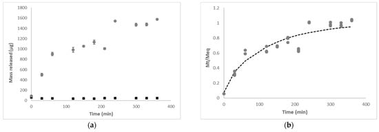 Profile of phenolic compounds release from alginate particles (T2—0.5 mol·L−1 formulation, 1.5% alginate and 0.5 mol·L−1 CaCl2): (a) mass of phenolic compounds released at pH 1.5 (■) and pH 7.2 (●); (b) experimental data of phenolic compounds release at pH 7.2 (●) and description of linear superimposition model (i = 1) (--).