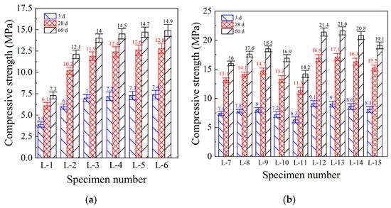 - Optimal amounts of GBFS, FA, and SSS can continuously and considerably increase the compressive strength and accelerate setting, even beyond that of cement-based materials with the same curing age. When 50%, 20%, and 30% of FGDG, GBFS, and FA were added, respectively, and 20 g of SSS was also added, the obtained mechanical properties were the best among all tested specimens. Specifically, the increase ranges were 95.1%, 23.5% and 15%, respectively and GBFS had the most obvious improvement effect. However, the excessive incorporation of FGDG, GBFS, FA, and SSS resulted in a decrease in compressive strength and an extension of the setting time.