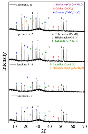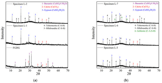 - XRD analysis showed that the pure FGDG specimen could not polymerize and form silicate and aluminosilicate minerals, which is the reason for the insufficient compressive strength and slow setting of this specimen. However, the addition of appropriate amounts of GBFS, FA, and SSS increased calcium and silicon contents stepwise, thus promoting the formation of different types of silicates and aluminosilicate minerals. Overall, this greatly improved the compressive strength and accelerated the setting of the specimen.