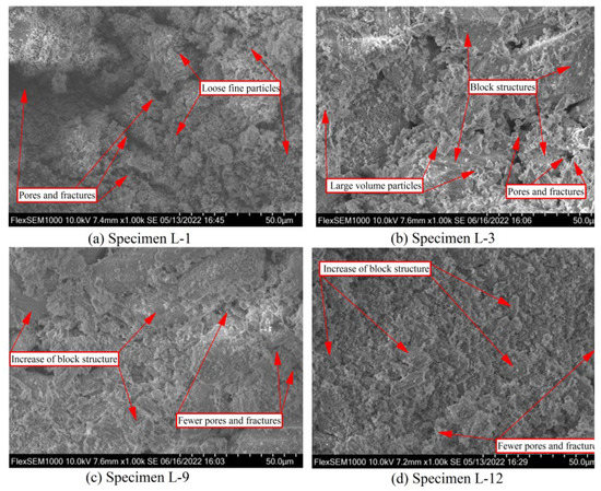 - SEM analysis showed that the strength of the pure FGDG specimen was produced by the condensation and crystallization of FGDG particles. However, the incorporation of GBFS, FA, and SSS continuously enhanced the polymerization reaction efficiency, generated massive gel products, and considerably reduced the number of cracks and pores. Consequently, both the microstructure and compressive strength were continuously improved.
