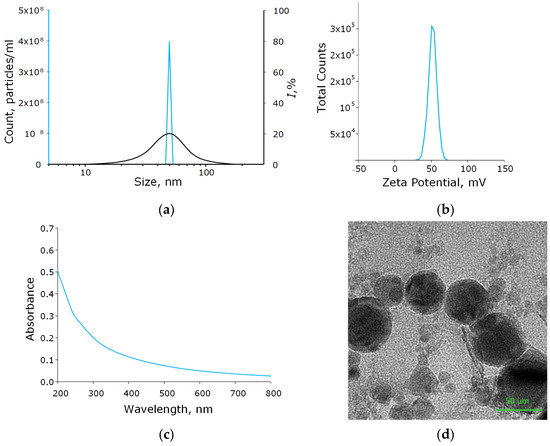 Physicochemical characteristics of the Al2O3-NPs colloidal solution. Concentration (solid blue line) and size distribution (black line) of Al2O3-NPs (a); ζ-potential of NPs (b); optical absorption spectrum of the obtained colloidal solution of NPs (c); TEM image of aluminum oxide nanoparticles (d).
